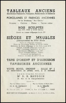 Tableaux anciens : des Écoles flamande, française, hollandaise et italienne : porcelaines et faïences anciennes : plat de Strasbourg "aux chinois" : bronzes, cuivres, étains, terres cuites : bois sculptés des XVIe, XVIIe et XVIIIe siècles : cartel en bronze d'époque Louis XV : sièges et meubles : principalement du XVIIIe siècle : fauteuils d'époque Régence .... : tapis d'Orient et d'Aubusson, tapisseries anciennes : vente Hôtel Drouot, Salle No 1, le mercredi 22 avril 1942 / commissaire-priseur: D.H. Baudoin ; assisté de: Pour les tableaux anciens R.Cl. Catroux, expert, pour les meubles et objets d'art B. Dillée, expert