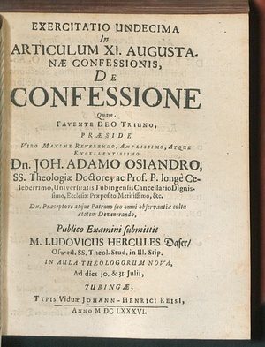 Exercitatio Undecima In Articulum XI. Augustanae Confessionis, De Confessione / Quam Favente Deo Triuno, Praeside ... Joh. Adamo Osiandro ... Publico Examini submittit M. Ludovicus Hercules Daser ... Ad dies 30. & 31. Julii
