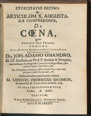 Exercitatio Decima In Articulum X. Augustanae Confessionis, De Coena / Quam Favente Deo Triuno, Praeside ... Joh. Adamo Osiandro ... Publico Eruditorum Examini subjicit M. Ludovic-Fridericus Salomon ... Ad dies [...] & [...] Junii