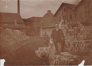 Mann im Anzug auf feuerfesten Steinen, "Rheinischen Schamotte- und Dinas Werke", Bendorf