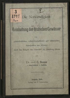 Die Notwendigkeit der Reinhaltung der deutschen Gewässer, vom gesundheitlichen, volkswirtschaftlichen und militärischen Standpunkte aus erläutert durch das Beispiel der Unterelbe bei Hamburg-Altona : mit einer Karte der Elbemündung / von G. Bonne