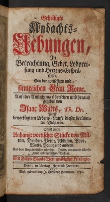 Geheiligte Andachts-Uebungen, in Betrachtung, Gebet, Lobpreisung und Herzens-Gesprächen / Von der gottseligen und sinnreichen Frau Rowe. Auf ihre Ansuchung übersehen und heraus gegeben von Isaac Watts, Th. Dr.