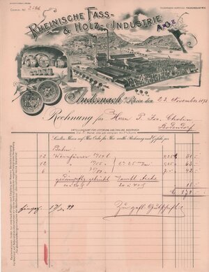 Lieferantenrechnung für 30 Weinfässer in verschiedenen Größen von der Rheinischen Fass- und Holzindustrie in Andernach vom 23.11.1898