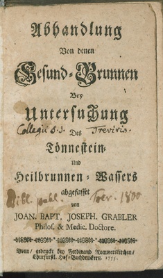 Abhandlung von denen Gesund-Brunnen bey Untersuchung des Tönnestein- und Heilbrunnen-Wassers / abgefasset von Joan. Bapt. Joseph Grabler
