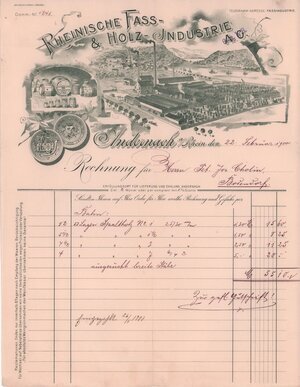 Lieferantenrechnung für für Lager Spaltholz von der Rheinischen Fass- und Holzindustrie in Andernach vom 16.10.1902