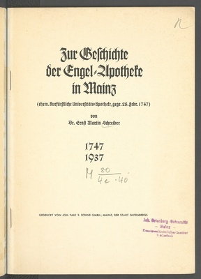Zur Geschichte der Engel-Apotheke in Mainz : (ehem. Kurfürstliche Universitäts-Apotheke, gegr. 28. Febr. 1747) ; 1747 - 1937 / von Ernst Martin Schreiber
