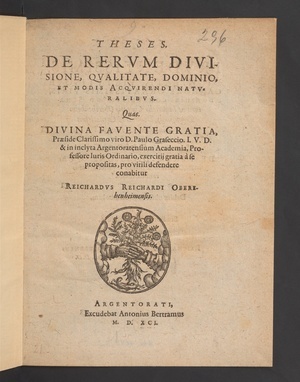 Theses de rerum divisione, qualitate, dominio et modis acquirendi naturalibus / quas ... praeside ... D. Paulo Graseccio ... defendere conabitur Reichardus Reichardi