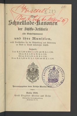 Die Schnellade-Kanonen der Schiffs-Artillerie (für Einheitspatronen) und ihre Munition, nebst Vorschriften für die Behandlung und Bedienung an Bord in Dienst befindlicher Schiffe