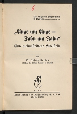 "Auge um Auge - Zahn um Zahn" : eine vielumstrittene Bibelstelle / von Dr. Joseph Norden (Rabbiner der jüdischen Gemeinde in Elberfeld)
