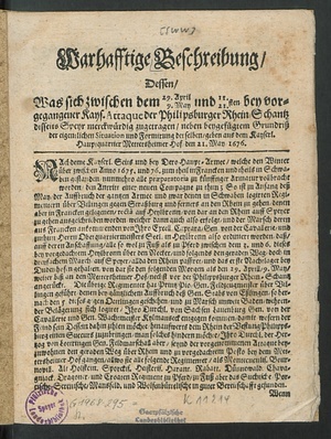 Warhafftige Beschreibung/ Dessen/ Was sich zwischen dem 29. April 9. May und 11. 21. sten bey vorgegangener Kays. Attaque der Philipsburger Rhein-Schantz diesseits Speyr merckwürdig zugetragen : neben beygefügtem Grundriß der eigentlichen Situation und Formirung derselben/ geben aus dem Kayserl. Hauptquartier Mettersheimer Hof den 21. May 1676