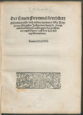 Der Erbren Frey vnnd Reychstett || gesandten erste/ vnd andere antwurt/ über Kay.|| Maye. übergebne Jnstruction/ durch sie/ sampt || ettlichen beschwernussen gegen den gaystlich=||en/ yetz zů Speyr/ auff dem Reychß=||stag überantwurt.||