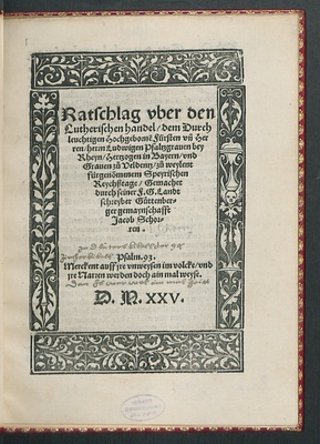 Ratschlag vber den || Lutherischen handel/ dem Durch||leuchtigen Hochgebornẽ Fürsten vñ Her||ren/ herrn Ludwigen Pfaltzgrauen bey || Rheyn/ Hertzogen in Bayern/ vnd || Grauen zů Veldentz/ zů weylent || fürgenõmenem Speyrischen || Reychßtage/ Gemachet || durch seiner F.G. Landt||schreyber Gůttenber=||ger gemaynschafft || Jacob Schor=||ren.|| ... ||