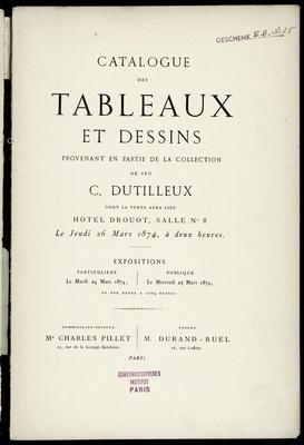 Catalogue des tableaux et dessins provenant en partie de la collection de feu C. Dutilleux, dont la vente aura lieu Hotel Drouot, le jeudi 26 mars 1874 / commissaire-priseur Charles Pillet ...