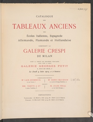 Catalogue des tableaux anciens des écoles italienne, espagnole, allemande, flamande et hollandaise composant la Galerie Crespi de Milan, dont la vente ... aura lieu à Paris Galerie Georges Petit le jeudi 4 juin 1914 / [Catalogue par Marcel Nicolle]. Commissaire-priseur Me Lair-Dubreuil ...