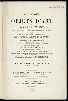 Catalogue des objets d'art et d'ameublement, faïences italiennes, françaises & autres, grès ..., sculptures en albâtre et en marbre ..., tableaux anciens ..., tableaux modernes ... formant la collection de M. Guillaume et dont la vente, par suite de son décès, aura lieu Hotel Drouot le jeudi 14 mai 1891 / Paul Chevallier commisaire-priseur ...