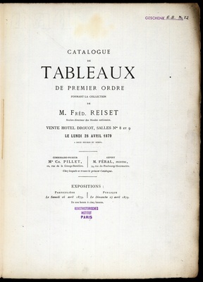 Catalogue de tableaux de premier ordre formant la collection de M. Fréd. Reiset, ancien directeur des Musées nationaux : vente Hôtel Drouot le lundi 28 avril 1879 / commissaire-priseur Ch. Pillet ...