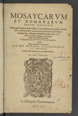 Mosaycarum et Romanarum legum Collatio, ex integris Papiniani, Pauli, Ulpiani, Gaij, Modestini, aliorumque veterum iuris auctorum libris ante tempora Iustiniani imp. desumpta : eiusdem Imp. Iustiniani novellae constitutiones III. Iuliani antecessoris C. P. dictatum de consiliariis ; eiusdem Iuliani collectio de contutoribus / ex bibliotheca P. Pithoei IC. cuius etiam Notae emendatiores adiectae sunt