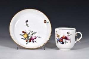 Teile eines Kaffeservice, dekoriert mit bunten Früchten und Gemüsestilleben