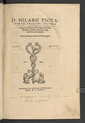 D. Hilarii Pictavorvm Episcopi Lvcvbrationes Qvotqvot Extant : olim per Des. Erasmum Rot. haud mediocribus sudoribus emendatae, nunc denuo uigilantissima cura recognitar. : harum catalogum reperies versa hac pagina