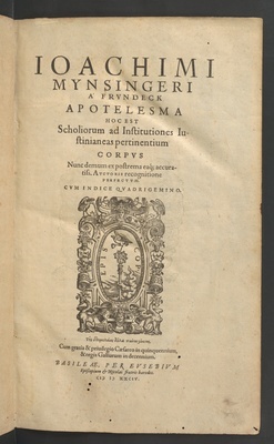 Ioachimi Mynsingeri A Frvndeck Apotelesma Hoc Est Scholiorum ad Institutiones Iustinianeas pertinentium Corpvs : Cvm Indice Qvadrigemino