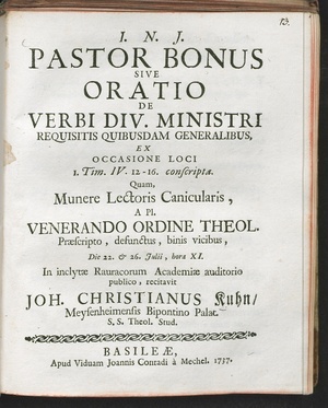 Pastor Bonus Sive Oratio De Verbi Div. Ministri Requisitis Quibusdam Generalibus : Ex Occasione Loci 1. Tim. IV. 12 - 16. conscripta / Quam Munere Lectoris Canicularis, ... recitavit Joh. Christianus Kuhn ...