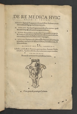 De Re Medica Hvic Volvmini Insvnt, ... Accessit His Vice Coronidis, Libellus utilissimus de Betonica, quem quidam Antonio Musæ, no[n]nulli L. Apuleio adscribendum autumant, nuper excusus. Praeterea Rerum & uerborum locupletissimus Index