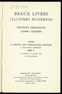 Beaux livres, illustrés modernes : éditions originales, livres anciens : le jeudi 17 juin 1943 / Commissaire-priseur: Me D.-H. Baudoin ; Hôtel des Commissaires-Priseurs