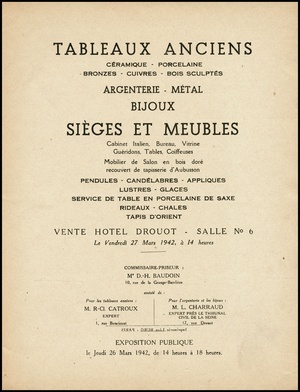 Tableaux anciens : céramique, porcelaine, bronzes, cuivres, bois sculptés : argenterie, métal, bijoux : sièges et meubles : Cabinet italien, bureau, vitrine, guéridons, tables, coiffeuses : mobilier de Salon en bois doré recouvert de tapisserie d'Aubusson : pendules, candélabres, appliques, lustres, glaces, service de table en porcelaine de Saxe, rideaux, chales, tapis d'Orient : vente Hôtel Drouot, Salle No 6, le vendredi 27 mars 1942 / commissaire-priseur: D.-H. Baudoin ; assisté de: Pour les tableaux anciens R.Cl. Catroux, pour l'argenterie et les bijoux: L. Charraud