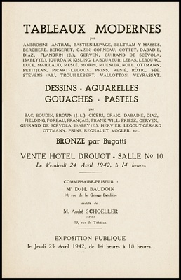 Tableaux modernes : par Ambrosini, Antral, Bastien-Lepage, Beltram y Massès [und weitere] : dessins, aquarelles, gouaches, pastels : par Bac, Boudin, Brown (J.L.), Cicéri, Craig, Dabadie, Diaz [und weitere] : bronze par Bugatti : vente Hôtel Drouot, Salle No 10, le vendredi 24 avril 1942 / commissaire-priseur: D.-H. Baudoin ; assisté de André Schœller