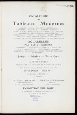 Catalogue des tableaux modernes : Allègre, Appian, Billotte, Carrière (Eug.) [und weitere] : aquarelles, pastels et dessins : Charlemont, Denis (Maurice), Detaille, Harpignies [und weitere] : bronze, marbre, terre cuite par Carpeaux Rodin : provenant de la Collection de Monsieur le Dr S*** : dont la vente aux enchères publiques aura lieu Hôtel Drouot, Salle No 1, le samedi 22 février 1919 / Henri Baudoin, commissaire-priseur ; J. Chaine & Simonson, experts