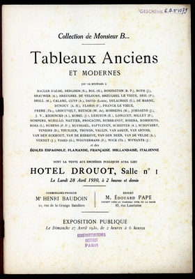 Tableaux anciens et modernes : par ou attribués à Bacler d'Albe, Berghem (N.), Bol (H.), Bonington (R. P.), Both (J.) [und weiteren] : et des Écoles espagnole, flamande, française, hollandaise, italienne : Collection de Monsieur B... : dont la vente aux enchères publiques aura lieu Hôtel Drouot, Salle No 1, le lundi 28 avril 1930 / commissaire-priseur Henri Baudoin ; expert Édouard Pape