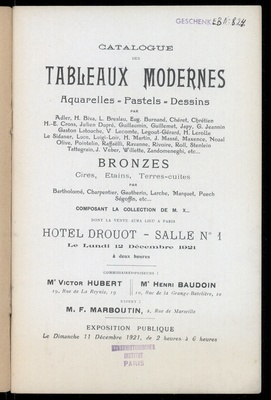 Catalogue des tableaux modernes : aquarelles, pastels, dessins : par Adler, H. Biva, L. Breslau, Eug. Burnand, Chéret, Chrétien [und weiteren] : bronzes, étains, terres-cuites : par Bartholomé, Charpentier, Gautherin [und weiteren] : composant la collection de M. X... : dont la vente aura lieu à Paris, Hôtel Drouot, Salle No 1, le lundi 12 décembre 1921 / commissaires-priseurs Victor Hubert, Henri Baudoin ; expert F. Marboutin