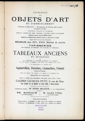 Catalogue des objets d'art et d'ameublement : faïences de Marseille - porcelaines de Sèvres pâte tendre : porcelaines de Saxe : orfèvrerie française et allemande : petit groupe en terre cuite par Clodion : bustes en terre cuite du XVIIIe siècle : bronzes et pendules des époques Louis XV, Louis XVI et autres : sièges couverts en ancienne tapisserie: meubles des XVIe, XVIIIe siècles et autres : tapisseries des gobelins de Beauvais, des Flandres et d'Aubusson : tableaux anciens et modernes : par H.-P. Danloux [und weiteren] : aquarelles, dessins, gouaches, pastel, miniatures : par J.-B. Huet [und weiteren] : gravures en couleurs : dont la vente aux enchères publiques aura lieu à Paris, Galerie Georges Petit, 8, rue de Sèze, les lundi 14 et mardi 15 juin 1920 / commissaire-priseur Henri Baudoin ; experts M. Mannheim, Jules Féral