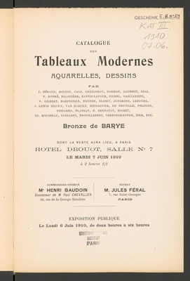 Catalogue des tableaux modernes, aquarelles, dessins par J. Béraud, Boudin, Cals, Chaigneau, Cormon, Courbet, Diaz, V. Dupré, Falguière, Fantin Latour, Fichel, Gagliardini, V. Gilbert, Harpignies, Henner, Isabey, Jongkind, Lebourg, J. Lewis Brown, Van Marcke, Meissonier, De Neuville, Pelouse, Pissarro, Plassan, H. Regnault, Richet, Th. Rousseau, Tassaert, Trouillebert, Verboeckhoven, Ziem, etc., bronze de Barye, dont la vente aura lieu à Paris, Hotel Drouot, le mardi 7 juin 1910 / commissaire-priseur Henri Baudoin, successeur de Paul Chevalier ...