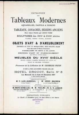 Catalogue des tableaux modernes : aquarelles, pastels & dessins : tableaux, gouaches, dessins anciens, deux beaux pastels par Louis Vigée : sculptures des XVIIe & XVIIIe siècles : platre, terres, cuites, marbres : objets d'art & d'ameublement : coffrets en cuir et marqueterie, bois sculpté, glace : grand bas-relief de l'Époque Renaissance : porcelaines de Chine & du Japon : bronzes d'art et d'ameublement des XVIIe & XVIIIe siècles : meubles du XVIIIe siècle : beaux sièges Cannés Régence et Louis XV : écran en ancienne tapisserie : provenant de la Collection de Georges Petit : et dont la vente aux enchères publiques aura lieu Hôtel Drouot, Salle No 6, les mercredi 14 et jeudi 15 décembre 1927 / commissaires-priseurs: F. Lair Dubreuil, Henri Baudoin ; experts pour les tableaux, dessins modernes André Schœller, pour les tableaux, dessins anciens et objets d'art M. Paulme, G. B. Lasquin