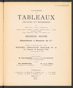 Catalogue de tableaux anciens et modernes par Albert Cuyp, J. Steen, D,. Teniers ... etc., aquarelles, gravure : appartenant à Monsieur de C*** [Camondo] et dont la vente aura lieu à Paris, Hotel Drouot, le vendredi 18 novembre 1910 / commissaire-priseur Henri Baudoin ...