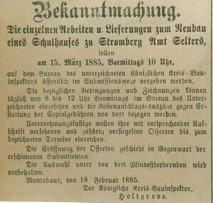 Bekanntmachung zum Neubau des Schulhauses in Bendorf-Stromberg, 1885