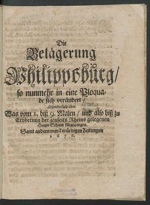 Die Belägerung Philippsburg/ so nunmehr in eine Ploquade sich verändert/ absonderlich aber Was vom 1. biß 9. Majen/ und also biß zu Eroberung der jenseits Rheins gelegenen Haupt-Schantz fürgegangen : Samt andern merckwürdigen Zeitungen