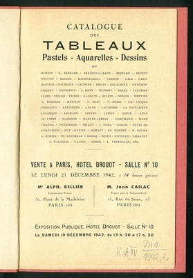 Catalogue des tableaux, pastels, aquarelles, dessins,... : vente, Paris, Hôtel Drouot, salle n°10, le lundi 21 décembre 1942 / , Alphonse Bellier, commissaire-priseur ; Jean Cailac, expert.