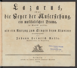 Lazarus oder die Feyer der Auferstehung : ein musikalisches Drama / in Musik gesetzt, und als ein Auszug zum Singen beym Klaviere herausgegeben von Johann Heinrich Rolle