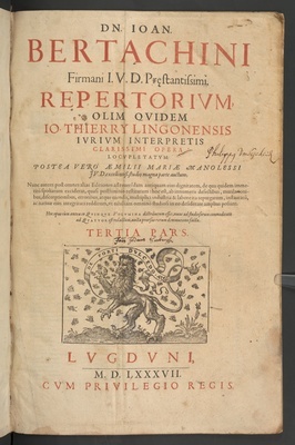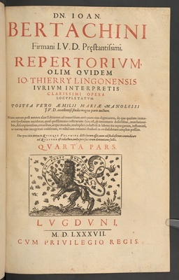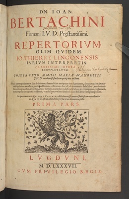 Io. Bertachini Firmani, Repertorij Pars ... Repertorivm Clarissimi viri ... Io. Bertachini Firmani: in quo, quicquid notatu, cognitúque dignum, in ... lecturis habetur, miro artificio, seriéque Alphabetica congestum, reperias. Cui, pre̜ter alias ... Additiones, ingens accessit ... Corollarioru[m], Additionumq́[ue] ... Thesaurus ..