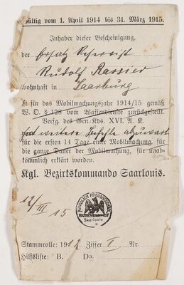 Reservistenbescheinigung für Rudolf Rassier von 1914