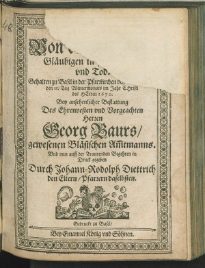 Von ... Gläubigen ... vnd Tod. : Gehalten zu Basel in der Pfarrkirchen ... den 11. Tag Wintermonats im Jahr Christi des Herren 1670. Bey ansehenlicher Bestattung Des ... Herren Georg Baurs/ gewesenen Bläsischen Am[m]tmanns. / ... in Druck gegeben Durch Johann-Rodolph Diettrich den Eltern/ Pfarrern daselbsten