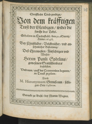 Christliche Leich-predigt/ Von dem kräfftigen Trost der Gleubigen/ wider die forcht des Tods. : Gehalten in Liechtstahl/ den 30. Martij/ Anno 1648. Bey Christlicher/ Volckreicher/ vnd ansehenlicher Bestattung/ Deß ... Herren Pauli Spörlins/ gewesenen Stattschreibers daselbsten. / ... in Truck gegeben: Durch Hieronymum Gemusaeum/ selbigen Orts Pastorem