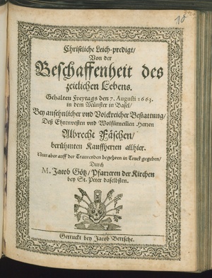 Christliche Leich-predigt/ Von der Beschaffenheit des zeitlichen Lebens. : Gehalten freytags den 7. Augusti 1663. in dem Münster in Basel/ Bey ... Bestattung/ Deß ... Herren Albrecht Fäschen/ berühmten Kauffherren allhier. / ... in Truck gegeben/ Durch M. Jacob Götz/ Pfarreren der Kirchen bey St. Peter daselbsten