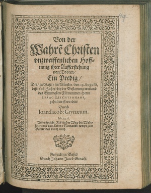 Von der Wahre[n] Christen vnzweiffenlichen Hoffnung ihrer Aufferstehung von Todten : Ein Predig/ Die/ zu Basel/ im Münster/ den 19. Augusti, diß 1608. Jahrs/ bey der Bestattung/ weiland des ... Herrn Isaac Liechtenhans / gehalten ist worden/ Durch Ioan: Iacob: Grynaeum