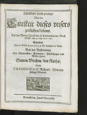 Christliche Leich-predigt/ Von der Eitelkeit dieses vnsers zeitlichen Lebens ... : Gehalten Den 16. Octob. Anno 1663. zu St. Leonhard in Basel/ Bey der Bestattung Des ... Herren Simon Blechen/ des Raths. / Durch THEODORUM Richard/ Pfarrern selbiger Gmeind