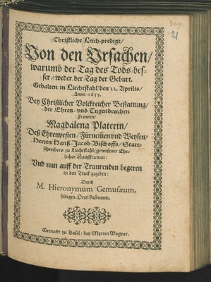 Christliche Leich-predigt/ Von den Ursachen/ warumb der Tag des Tods besser/ weder der Tag der Geburt. : Gehalten in Liechtstahl den 12. Aprilis/ Anno 1655. Bey Christlicher Volckreicher Bestattung/ der ... frawen... Magdalena Platerin/ Deß ... Herren Hanß-Jacob Bischoffs ... gewesener Ehelicher Haußfrawen / ... in Truck gegeben: Durch M. Hieronymum Gemusaeum, selbigen Orts Pastorem