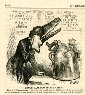 Uncle Sam put in his "Bier". Herr O.O. Noodle-Dorfer. "But even this, considering the indifference of the American People for fairness and justice, will only serve as a funeral discourse over the grave of the Republic!" : ein Krokodil, das Oswald Ottendorfer darstellt, hat Uncle Sam in einen Bierkrug geworfen / Th. Nast