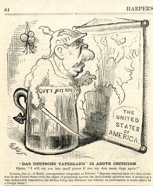 "Das deutsche Vaterland" is above criticism. Froth. "I will cut you into small pieces if you say dem mean tings again!" [Anschließend folgt ein Textblock] : der Schaum in einem Bierkrug nimmt die Gestalt Bismarcks an und bedroht eine Landkarte der USA mit dem Säbel / Th. Nast